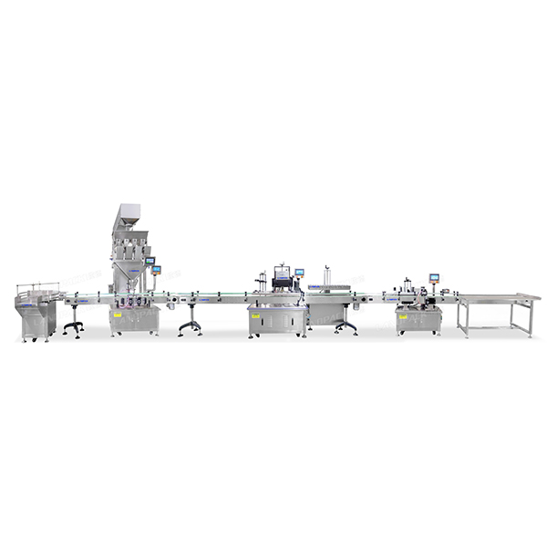 理瓶-線性秤灌裝機(jī)-人工上蓋-四輪旋蓋-鋁箔封口-貼標(biāo)-收集平臺(tái)